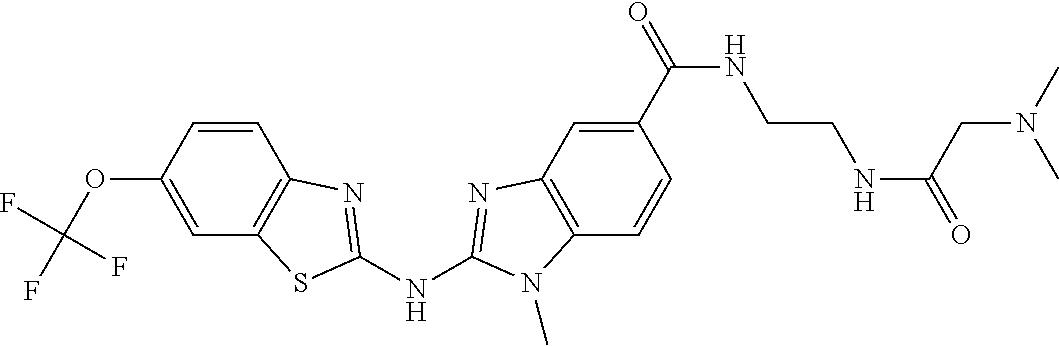- KKZNBFOUHGSGIM-UHFFFAOYSA-N n-[3-(dimethylamino)-3-oxopropyl]-1-methyl-2-[[6-(trifluoromethoxy)-1,3-benzothiazol-2-yl]amino]benzimidazole-5-carboxamide Chemical compound C1=C(OC(F)(F)F)C=C2SC(NC=3N(C)C4=CC=C(C=C4N=3)C(=O)NCCC(=O)N(C)C)=NC2=C1 KKZNBFOUHGSGIM-UHFFFAOYSA-N 0.000 claims description 3