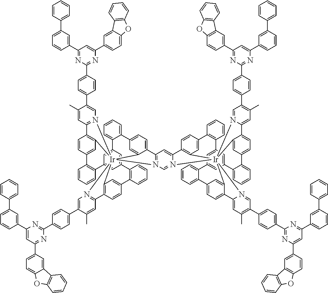 - XEYFAHWFYWLLDL-UHFFFAOYSA-N C1=CC=C2C3=CC4=CC(=C3)C3=C(C=CC=C3)C3=CC5=C(C=C3)C3=N(C=CC=C3)[Ir]536(C5=CC(=CC=C5C5=N3C3=N(C7=N5[Ir]589%10C%11=CC(=CC=C%117)C7=CC=CC=C7C7=CC(=CC(=C7)C7=C(C=CC=C7)C7=CC5=C(C=C7)C5=N8C=CC=C5)C5=C(C=CC=C5)C5=CC9=C(C=C5)C5=N%10C=CC=C5)[Ir]5789C%10=CC(=CC=C%103)C3=CC=CC=C3C3=CC(=CC(=C3)C3=C(C=CC=C3)C3=CC5=C(C=C3)C3=N7C=CC=C3)C3=C(C=CC=C3)C3=CC8=C(C=C3)C3=N9C=CC=C3)C2=C1)C1=C(C=CC(=C1)C1=C4C=CC=C1)C1=N6C=CC=C1 Chemical compound C1=CC=C2C3=CC4=CC(=C3)C3=C(C=CC=C3)C3=CC5=C(C=C3)C3=N(C=CC=C3)[Ir]536(C5=CC(=CC=C5C5=N3C3=N(C7=N5[Ir]589%10C%11=CC(=CC=C%117)C7=CC=CC=C7C7=CC(=CC(=C7)C7=C(C=CC=C7)C7=CC5=C(C=C7)C5=N8C=CC=C5)C5=C(C=CC=C5)C5=CC9=C(C=C5)C5=N%10C=CC=C5)[Ir]5789C%10=CC(=CC=C%103)C3=CC=CC=C3C3=CC(=CC(=C3)C3=C(C=CC=C3)C3=CC5=C(C=C3)C3=N7C=CC=C3)C3=C(C=CC=C3)C3=CC8=C(C=C3)C3=N9C=CC=C3)C2=C1)C1=C(C=CC(=C1)C1=C4C=CC=C1)C1=N6C=CC=C1 XEYFAHWFYWLLDL-UHFFFAOYSA-N 0.000 description 2
