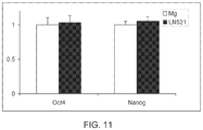 FIG. 11 shows the results of a real-time quantitative RT-PCR analysis which was used to compare numbers of mRNA transcripts of the pluripotency markers Oct4 and Nanog in human ES cells cultured on human r-laminin-521 (LN521) after several single cell dissociation passaging and in the cells cultured on Matrigel (Mg) after several passaging of the cells in clumps. Error bars show 95% confidence intervals.