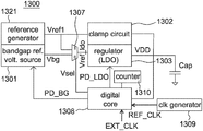 The bandgap reference circuit 1300 includes a reference generator 1321, a bandgap reference voltage source 1301, a clamp circuit 1302, a regulator 1303, a switching element 1307, a digital core 1308, a clock generator 1309 and a counter 1310, wherein the counter 1310 may not be implemented according to different applications.