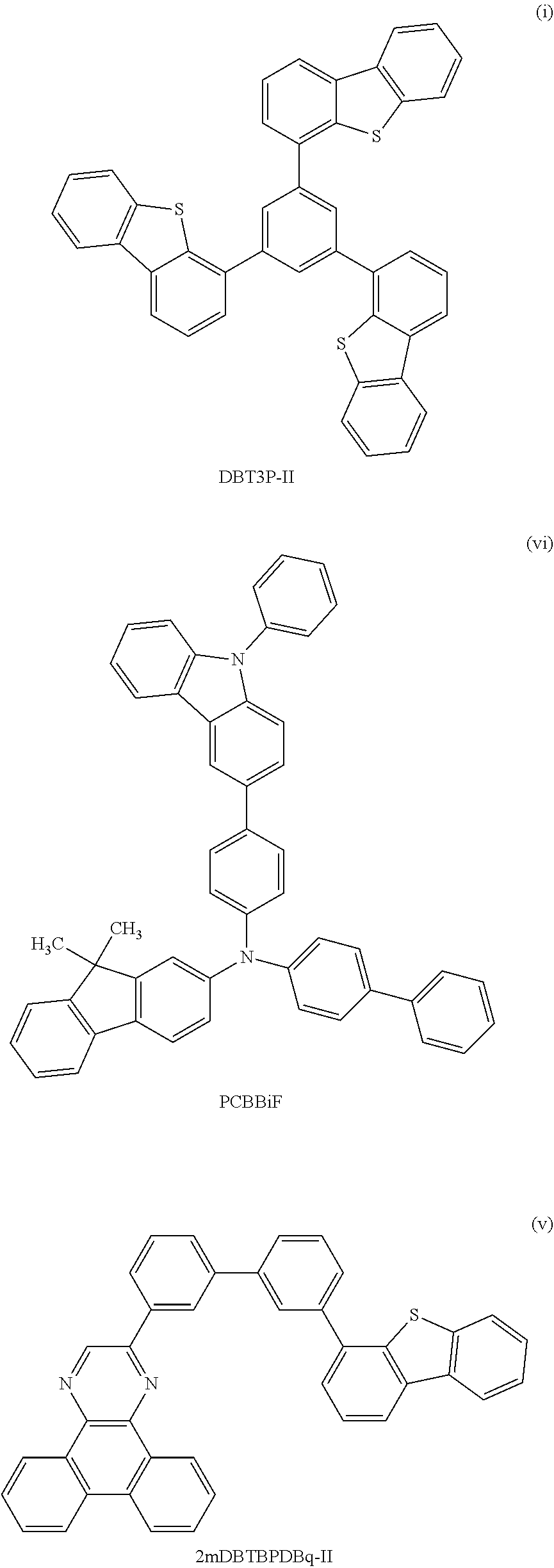 Then, on the hole-transport layer 112, the first phosphorescent layer 113 c-1 was formed in such a manner that 2-[3′-(dibenzothiophen-4-yl)biphenyl-3-yl]dibenzo[f,h]quinoxaline (abbreviation: 2mDBTBPDBq-II) represented by Structural Formula (v), N-(1,1′-biphenyl-4-yl)-N-[4-(9-phenyl-9H-carbazol-3-yl)phenyl]-9,9-dimethyl-9H-fluoren-2-amine (abbreviation: PCBBiF) represented by Structural Formula (vi), and bis {4,6-dimethyl-2-[5-(2,6-dimethylphenyl)-3-(3,5-dimethylphenyl)-2-pyrazinyl-NV]phenyl-KC}(2,4-pentanedionato-κ2O,O′)iridium(III) (abbreviation: [Ir(dmdppr-dmp)2(acac)]) represented by Structural Formula (vii) were deposited by co-evaporation to a thickness of 15 nm such that the weight ratio of 2mDBTBPDBq-II to PCBBiF and [Ir(dmdppr-dmp)2(acac)] was 0.1:0.9:0.06 (=2mDBTBPDBq-II:PCBBiF: [Ir(dmdppr-dmp)2(acac)]); the second phosphorescent layer 113 c-2 was successively formed in such a manner that 2mDBTBPDBq-II, PCBBiF, and bis[2-(6-tert-butyl-4-pyrimidinyl-N3)phenyl-KC](2,4-pentanedionato-κ2O,O′)iridium(III) (abbreviation: [Ir(tBuppm)2(acac)]) represented by Structural Formula (viii) were deposited by co-evaporation to a thickness of 5 nm such that the weight ratio of 2mDBTBPDBq-II to PCBBiF and [Ir(tBuppm)2(acac)] was 0.5:0.5:0.06 (=2mDBTBPDBq-II:PCBBiF:[Ir(tBuppm)2(acac)]). Through the above steps, the second light-emitting layer 113 c that was a phosphorescent layer was formed. After that, 2mDBTBPDBq-II and PCBBiF were deposited by co-evaporation to a thickness of 2 nm such that the weight ratio of 2mDBTBPDBq-II to PCBBiF was 0.5:0.5 (=2mDBTBPDBq-II:PCBBiF); thus, the separation layer 113 b was formed. Then, 7-[4-(10-phenyl-9-anthryl)phenyl]-7H-dibenzo[c,g]carbazole (abbreviation: cgDBCzPA) represented by Structural Formula (iii) and N,N′-bis(3-methylphenyl)-N,N′-bis[3-(9-phenyl-9H-fluoren-9-yl)phenyl]pyrene-1,6-diamine (abbreviation: 1,6mMemFLPAPrn) represented by Structural Formula (iv) were deposited by co-evaporation to a thickness of 20 nm such that the weight ratio of cgDBCzPA to 1,6mMemFLPAPrn was 1:0.025 (=cgDBCzPA:1,6mMemFLPAPrn); thus, the first light-emitting layer 113 a that was a fluorescent layer was formed. Through the above-described steps, the light-emitting layer 113 was formed.