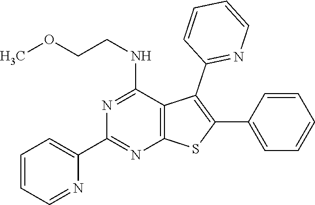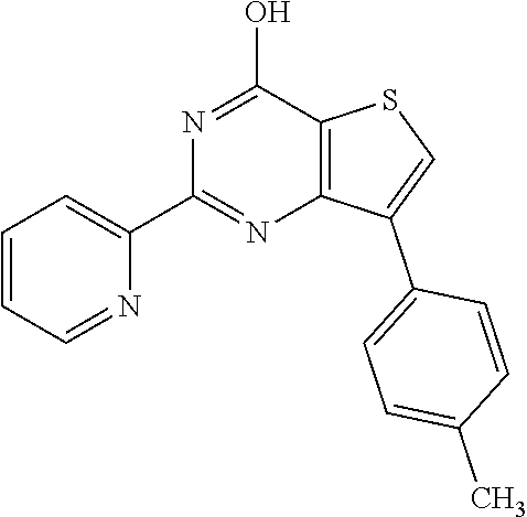 Step A: 2-Amino-5-methyl-4-phenylthiophene-3-carboxamide 123 (1.0 eq) was refluxed with 1-methylimidazole-4-carboxaldehyde (1.1 eq) in acetic (5 mL) acid for 24 h. After completion of the reaction (confirmed by TLC), solution was cooled and diluted with water. The precipitate was filtered off and dried to give compound 126 (Yield—87%) as a brown solid. The scale was calculated on 700 mg theoretical yield of product. Yield: 609 mg (87%).