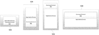 FIG. 5 is a diagram illustrating a display for processing devices of different sizes with which aspects of the present disclosure may be practiced. Examples shown in FIG. 5 comprise processing devices having varying sizes and/or varying screen/display sizes, for example processing device 502, processing device 504, processing device 506 and processing device 508. As shown in FIG. 5, the application command control 402 and the application/canvas 404 are displayed in example processing devices 502-508. As described in FIG. 4B, the application command control 402 is programmed to efficiently scale itself to utilize display space of processing devices of different sizes and/or operating size of display windows. For example, presentation of the application command control 402 across the different processing devices 502-508 may vary.