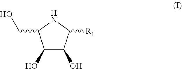 Surprisingly, compound 17 was able to enhance the mutant α-Gal A activity in a wide range of concentrations (from 0 to 100 μM). The addition of any of the compounds 17, 33, and 37 (100 μM) to N215S patient lymphocytes led to significant increases in α-Gal A activity (more than 10- and 18-folds increases for compounds 17 and 33, respectively), as compared with that of the control untreated cells (FIG. 2). Further, the chaperoning effect of 17 or 33 was better than that of DGJ or DIA. Specifically, the chaperoning effect of 33 was about 4-fold more potent than that of DGJ at the same concentration (25 μM), and about 13-fold more potent than that of DIA at the same concentration (100 μM).