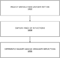 - differently magnifying and/or de-magnifying reflections of said first and second portions of the spatially non-uniform pattern of light spots using first and second optical portions of the at least one optical element, respectively, wherein the first optical portion of the at least one optical element has a higher magnification factor than the second optical portion of the at least one optical element.