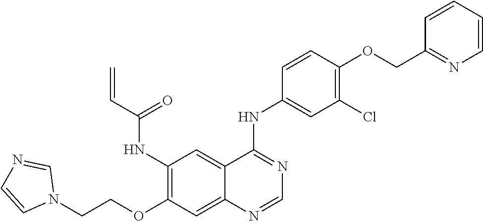To determine the ability of Compound No. 6 to target wild type HER2, wild type EGFR, and relevant mutants of each, a panel of BaF3 cell lines and the A431 cell line were dosed and assessed in cell proliferation assays. The BaF3 parental cell line is normally dependent on IL-3 for proliferation, but when transformed with active tyrosine kinase can grow in the absence of IL-3. However, when transformed kinase activity is inhibited by a targeted small molecule the associated proliferation is reduced in proportion to the extent of inhibition. A panel of BaF3 cell lines were generated by transforming the parental BaF3 cell line with wild type HER2 (HER2-WT), HER2 S310F (HER2-S310F), HER2 Exon 20 insertion YVMA (HER2-YVMA), EGFR-Exon 20 insertion ASV (EGFR-ASV), EGFR-Exon 20 insertion SVD (EGFR-SVD), or EGFR-Exon 20 insertion NPH (EGFR-NPH). The A431 lung cancer cell line, which natively expresses WT-EGFR, was used to assess WT-EGFR inhibition. To perform the proliferation assays, cells were plated in 96-well plates and subjected to various doses of Compound No. 6 to generate a dose-response curve for each cell line. Proliferation was assessed using the Cell Titer Glo cell proliferation kit (Promega # G7573). Briefly, Cell Titer Glo reagent was thawed and allowed to equilibrate at room temperature for 30 minutes. Plated and dosed cells were also allowed to equilibrate at Room Temperature for 30 minutes. Cell Titer Glo was added to plated cells at 15 ul per well, the plate was shaken for 20 minutes at room temperature, and luminescence was measured using Victor X3 Multimode plate reader (Perkin Elmer), Cell Titer Glo readings were taken following 72 hours (T72) after addition of Compound No. 6. Dose-response curves were generated for each cell line and IC50 values generated (FIG. 21). As shown in FIG. 21, compound No. 6 has the highest potency for HER-WT with an IC50 value <10 nM. Compound No. 6 has relatively high potency against HER2-S10F, HER2-ASV, EGFR-SVD, and EGFR-NPH, with IC50 values <100 nM. Compound No. 6 showed reduced potency against EGFR-WT, with an IC50 value >100 nM. These results indicate that Compound No. 6 targets and inhibits wild type HER2 and a variety of clinically relevant HER2 and EGFR mutants, but largely spares wild type EGFR in a cellular model.