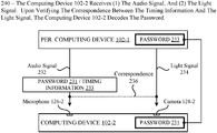 - the method can include the steps of (1) approving a request received from the peripheral computing device to engage in a setup procedure for the peripheral computing device, (2) receiving, from the peripheral computing device: (i) an audio signal that encodes a password and timing information, and (ii) a light signal. Additionally, the method can involve, in response to identifying that the timing information correlates with the light signal: (3) extracting the password from the audio signal, and (4) establishing a communication link with the peripheral computing device based on the password. In turn, the method can involve (5) providing configuration information to the peripheral computing device over the communication link.