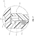 - the second fluid pathway in the core 104 may direct material from the first fluid pathway through a second interface 112 .
