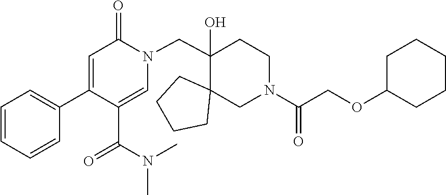 1-(((S)-7-((R)-3-Cyclohexyl-2-methylpropanoyl)-10-hydroxy-7-azaspiro[4.5]decan-10-yl)methyl)-6-oxo-4-phenyl-1,6-dihydropyridine-3-carboxylic acid (Example 211, Step 2) was purified by flash chromatography (0-10% MeOH in DCM) and freeze-dried to give the title compound as a white solid. LCMS (Method A): RT=1.61 min, m/z=535 [M+H]+. 1H NMR (500 MHz, DMSO-d6): δ 12.47 (br s, 1H), 8.43 (s, 1H), 7.54-7.12 (m, 5H), 6.28-6.20 (m, 1H), 5.03-4.91 (m, 1H), 4.80-4.60 (m, 1H), 4.16-3.96 (m, 1H), 3.92-3.58 (m, 2H), 3.54-3.30 (m, 1H, overlapping solvent), 2.94-2.80 (m, 1H), 2.03-1.83 (m, 1H), 1.80-0.65 (m, 26H).