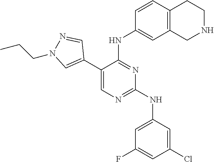 - 1-(4-(2-(3-methyl-4-chlorophenylamino)-5-(1-methyl-1H-pyrazol-4-yl)pyrimidin-4-ylamino)piperidin-1-yl)-2,2,2-trifluoroethanone (Compound 43);