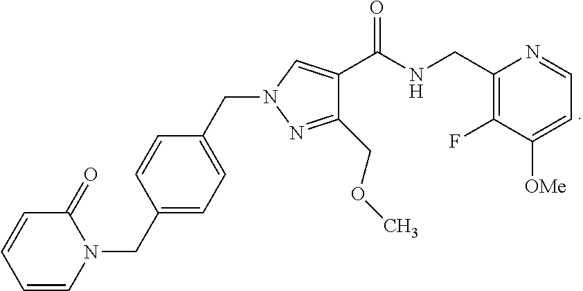 - KGMPDQIYDKKXRD-UHFFFAOYSA-N COCC1=NN(CC2=CC=C(CN3C=CC=CC3=O)C=C2)C=C1C(=O)NCC1=C(F)C(OC)=CC=N1 Chemical compound COCC1=NN(CC2=CC=C(CN3C=CC=CC3=O)C=C2)C=C1C(=O)NCC1=C(F)C(OC)=CC=N1 KGMPDQIYDKKXRD-UHFFFAOYSA-N 0.000 description 5