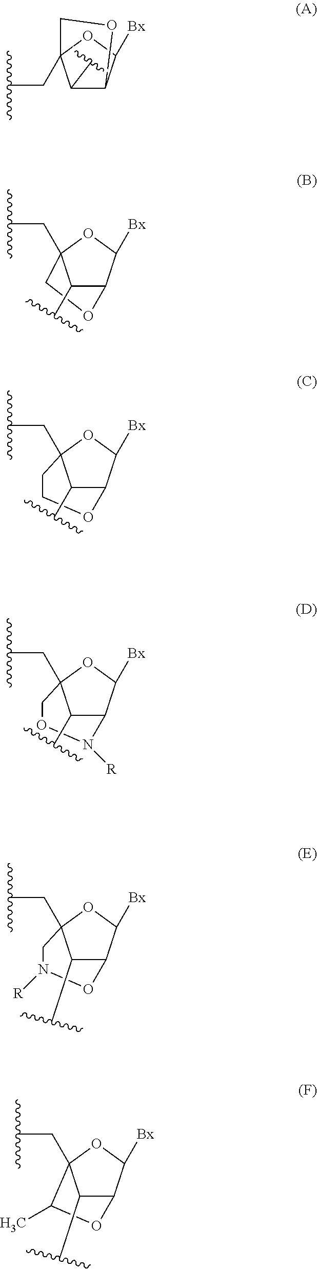 “Nucleoside mimetic” includes those structures used to replace the sugar or the sugar and the base and not necessarily the linkage at one or more positions of an oligomeric compound such as for example nucleoside mimetics having morpholino, cyclohexenyl, cyclohexyl, tetrahydropyranyl, bicyclo, or tricyclo sugar mimetics, e.g., non furanose sugar units. Nucleotide mimetic includes those structures used to replace the nucleoside and the linkage at one or more positions of an oligomeric compound such as for example peptide nucleic acids or morpholinos (morpholinos linked by —N(H)—C(═O)—O— or other non-phosphodiester linkage). Sugar surrogate overlaps with the slightly broader term nucleoside mimetic but is intended to indicate replacement of the sugar unit (furanose ring) only. The tetrahydropyranyl rings provided herein are illustrative of an example of a sugar surrogate wherein the furanose sugar group has been replaced with a tetrahydropyranyl ring system. “Mimetic” refers to groups that are substituted for a sugar, a nucleobase, and/or internucleoside linkage. Generally, a mimetic is used in place of the sugar or sugar-internucleoside linkage combination, and the nucleobase is maintained for hybridization to a selected target.