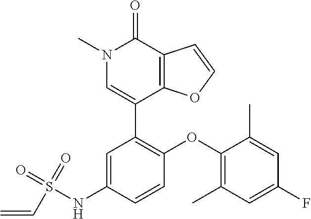 - WTINVZBFIJTZPU-UHFFFAOYSA-N C=CS(=O)(=O)NC1=CC(N2C=C(C)C(=O)C3=C2C=C(C2=NN=C(C)O2)C3)=C(OC2=C(C)C=C(F)C=C2C)C=C1 Chemical compound C=CS(=O)(=O)NC1=CC(N2C=C(C)C(=O)C3=C2C=C(C2=NN=C(C)O2)C3)=C(OC2=C(C)C=C(F)C=C2C)C=C1 WTINVZBFIJTZPU-UHFFFAOYSA-N 0.000 description 2