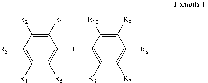 Furthermore, at least 1 or more, 2 or more, 2 to 10, 2 to 8, 2 to 6, 2 to 4, 2 to 3 or 2 of R1 to R10 in Formula 1 may be any one selected from the group consisting of —(O-A)n-R, -(A-O)n—R, —(O-A-O)n—R, a (meth)acryloyl group, a (meth)acryloyloxy group, a (meth)acryloyloxyalkyl group and a (meth)acryloyloxyalkyloxy group, where at least R3 and R8 may be any one selected from the above —(O-A)n-R, -(A-O)n—R, —(O-A-O)n—R, (meth)acryloyl group, (meth)acryloyloxy group, (meth)acryloyloxyalkyl group and (meth)acryloyloxyalkyloxy group.