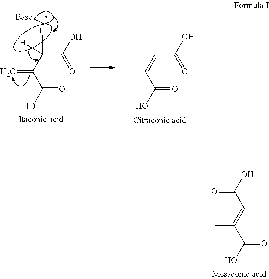 In contrast, polymerization of itaconic acid in acidic medium does not favor the rearrangement of itaconic to less reactive citraconic acid. Polymerization of itaconic acid in an acidic medium has been reported in “Polymerization of itaconic acid and some of its derivatives” Marvel et al, Journal of Organic Chemistry, (1959), 24, 599, and in “Polymerization of Itaconic Acid In Aqueous Solution: Structure Of The Polymer And Polymerization Kinetics At 25° C. Studied By Carbon-13 NMR,” Grespos et al, Makromolekulare Chemie, Rapid Communications (1984), 5(9), 489-494. However, these methods have disadvantages such as poor conversion with lengthy polymerization times and corrosivity issues. Similarly, WO 2001/21677 describes an itaconic acid polymerization comprising a free radical generator (persulfate) and a phosphorous-containing reducing agent, which gives a product with undesirable phosphorous components.