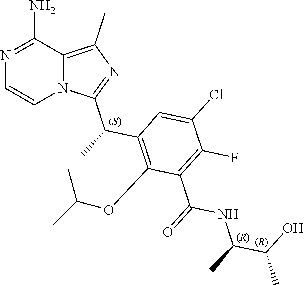 PI3K family is divided into three classes II, and III) based on structure, regulation and substrate specificity [Vanhaesebroeck, B., et al., The emerging mechanisms of isoform- Specific PI3K signalling. Nat Rev Mol Cell Biol, 2010. 11(5): p. 329-41.]. Class I PI3Ks are further divided based on sequence similarity into class IA and class IB. The class IA PI3Ks comprise three closely related kinases, PI3Kα, PI3Kβ, and PI3Kδ, which exist as heterodimers composed of a catalytic subunit (p110α, p110β, or p110δ) and a regulatory subunit (p85) [Yu, J., et al., Regulation of the p85/p110 phosphatidylinositol 3′-kinase: stabilization and inhibition of the p110alpha catalytic subunit by the p85 regulatory subunit. Mol Cell Biol, 1998. 18(3): p. 1379-87; Carpenter, C. L., et al., Phosphoinositide 3-kinase is activated by phosphopeptides that bind to the SH2 domains of the 85-kDa subunit. J Biol Chem, 1993. 268(13): p. 9478-83; Zhang, X., et al., Structure of lipid kinase p110beta/p85beta elucidates an unusual SH2-domain-mediated inhibitory mechanism. Mol Cell, 2011. 41(5): p. 567-78; Burke, J. E., et al., Dynamics of the phosphoinositide 3-kinase p110delta interaction with p85alpha and membranes reveals aspects of regulation distinct from p110alpha. Structure, 2011. 19(8): p. 1127-37.]. The class IB PI3K includes only PI3Kγ, which is composed of a p110γ [Stoyanov, B., et al., Cloning and characterization of a G protein-activated human phosphoinositide-3 kinase. Science, 1995. 269(5224): p. 690-3.] catalytic subunit that can associate with a p101 [Stephens, L. R., et al., The G beta gamma sensitivity of a PI3K is dependent upon a tightly associated adaptor, p101. Cell, 1997. 89(1): p. 105-14; Brock, C., et al., Roles of G beta gamma in membrane recruitment and activation of p110 gamma/p101 phosphoinositide 3-kinase gamma. J Cell Biol, 2003, 160(1): p. 89-99,] or p84[Suire, S., et al., p84, a new Gbetagamma-activated regulatory subunit of the type IB phosphoinositide 3-kinase p110gamma. Curr Biol., 2005. 15(6): p. 566-70.] regulatory subunit. PI3Kα and PI3Kδ respond to signaling generally through receptor tyrosine kinases (RTKs) [Inukai, K., et al., Five isoforms of the phosphatidylinositol 3-kinase regulatory subunit exhibit different associations with receptor tyrosine kinases and their tyrosine phosphorylations. FEBS Lett, 2001. 490(1-2): p. 32-8.], while PI3Kγ signals through G-protein-coupled receptors (GPCRs) [Stoyanov, B., et al., Cloning and characterization of a G protein-activated human phosphoinositide-3 kinase. Science, 1995. 269(5224): p. 690-3; Maier, U., A. Babich, and B. Nurnberg, Roles of non-catalytic subunits in gbetagamma-induced activation of class I phosphoinositide 3-kinase isoforms beta and gamma. J Biol Chem, 1999. 274(41): p. 29311-7.] and PI3Kβ signals through both [Kurosu, H., et al., Heterodimeric phosphoinositide 3-kinase consisting of p85 and p110beta is synergistically activated by the betagamma subunits of G proteins and phosphotyrosyl peptide. J Biol Chem, 1997. 272(39): p. 24252-6]. Expression of the PI3Kα and PI3Kβ isoforms is ubiquitous, while the expression pattern of PI3Kδ and PI3Kγ seems more restricted, with both isoforms found primarily in leukocytes [Kok, K., B. Geering, and B. Vanhaesbroeck, Regulation of phosphoinositide 3-kinase expression in health and disease. Trends Biochem Sci, 2009. 34(3): p. 115-27].