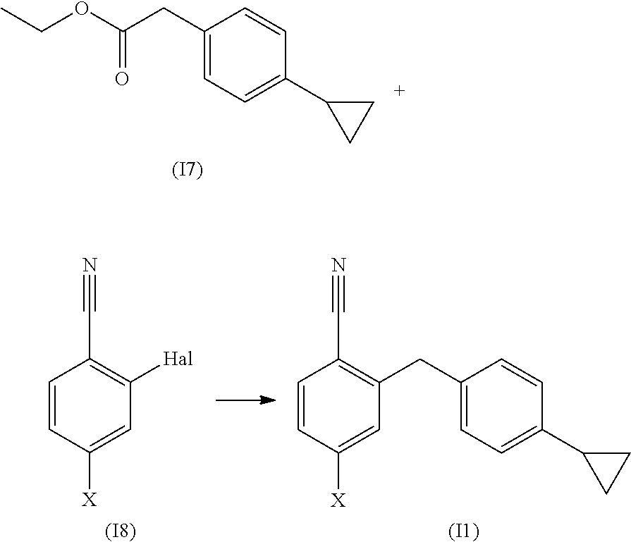 - complex synthesis 1-cyano-2-(4-cyclopropyl-benzyl)-4-(β-D-glucopyranos-1-yl)-benzene with numerous intermediate steps non-commercially available starting material requires synthesis of precursors for the final synthesis of 1-cyano-2-(4-cyclopropyl-benzyl)-4-(β-D-glucopyranos-1-yl)-benzene