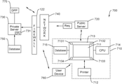 FIG. 7 depicts a policy-based printing system 700 located at a public location such as a convenience store in accordance with the disclosed embodiments. In the disclosed embodiment, printing device 710 includes a display screen 711 that is connected with a printer 712. Display screen 711 may be a touch screen or a monitor with a keyboard. Through display screen 711, a user is able to access information from public server 720 and private server 730 via network 740. Printing device 710 may have a configuration similar to printing device 104 of FIG. 2. For brevity, only some elements of the printing device are shown in FIG. 7. There may be more than one private server, but only one is shown in FIG. 7 for brevity. To access information, users other than staff of the public places (i.e., public users) are required to input authentication information, such as username and password, through display screen 711. The authentication information input by users is then compared with preset authentication information stored in database 750 located within a private domain. If they are matched, the users gain permission to access private server 730. In some cases, before granting a permission, private server 730 may send codes to users through user device 760. Users, upon receiving the codes, then enter the code on display screen 711 for further authentication.