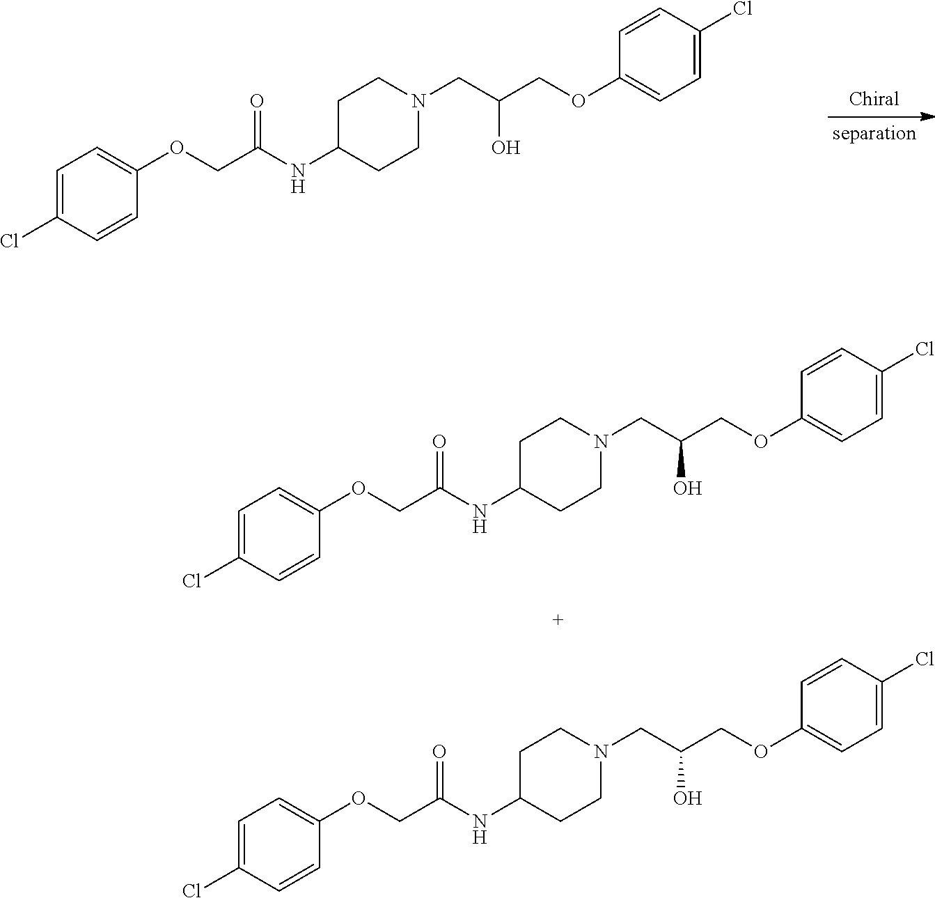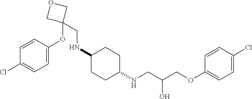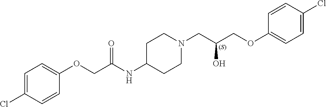 - OUSDOIKTWQXKLR-UHFFFAOYSA-N NC(COC1=CC=C(Cl)C=C1)CN1CCC(NCC(O)COC2=CC=C(Cl)C=C2)CC1 Chemical compound NC(COC1=CC=C(Cl)C=C1)CN1CCC(NCC(O)COC2=CC=C(Cl)C=C2)CC1 OUSDOIKTWQXKLR-UHFFFAOYSA-N 0.000 description 2