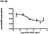 FIG. 9 shows that mAb-028 inhibits the ability of CD38 to catalyze the formation of NAADP. The inhibition of NAADP production by mAb-028 is concentration dependent (FIG. 9B) with an IC50 of 0.14 μg/mL.