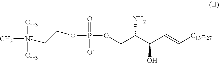 It can be taken from the above that the level of free lyso-sphingomyelin is elevated, by approximately factor 2 to 3, in the cerebellum in NPC1−/− animals to samples from control animals without gene-knock-out, i.e. NPC1+/+.
