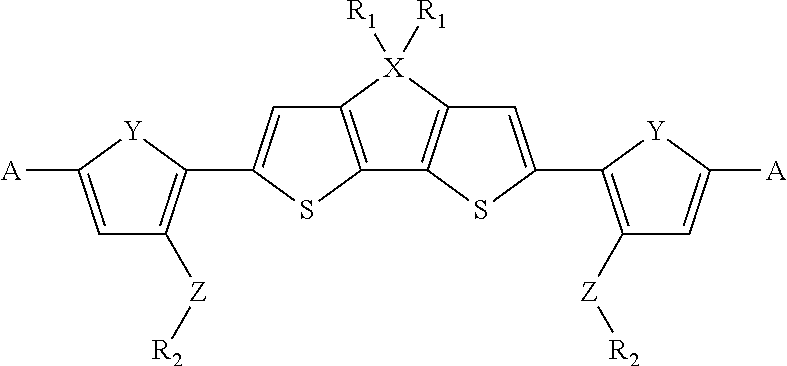 wherein X is C, Si, Ge, Nor P; Y is O, S or Se; Z is O or S; Each R1 and R2 is independently hydrogen or a substituted or non-substituted alkyl, aryl or alkoxy chain. A is an acceptor moiety, examples of A are listed in FIGS. 22A-22G.