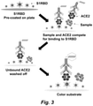 - FIG. 2 schematically shows an embodiment of the assay method of the disclosure wherein Angiotensin Converting Enzyme 2 (ACE2) coats the surfaces of the wells of a microtiter plate, a mammalian cell-expressed S1RBD polypeptide tagged with an immunoglobulin Fc region tag binds to the ACE2, and detected with an anti-Fc antibody conjugated to a detectable label and which binds to the tag of the bound S1RBD polypeptide.