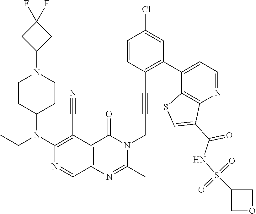 - QYMHJCNNNOKGHG-UHFFFAOYSA-N Cc1nc2cnc(N(C)C3CCN(C4CC(F)(F)C4)CC3)c(C#N)c2c(=O)n1CC#Cc1ccc(Cl)cc1-c1ccnc2c(C(=O)NS(C)(=O)=O)csc12 Chemical compound Cc1nc2cnc(N(C)C3CCN(C4CC(F)(F)C4)CC3)c(C#N)c2c(=O)n1CC#Cc1ccc(Cl)cc1-c1ccnc2c(C(=O)NS(C)(=O)=O)csc12 QYMHJCNNNOKGHG-UHFFFAOYSA-N 0.000 description 4