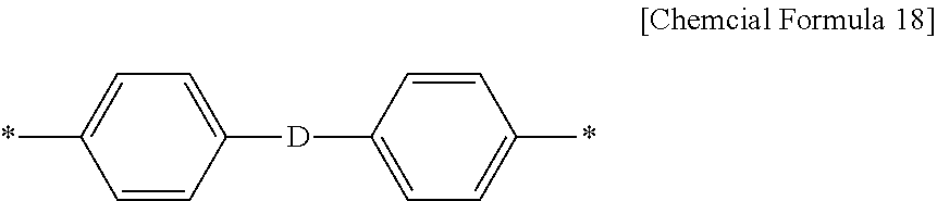 In Chemical Formula 16, D is a direct bond, —O—, —SO2—, or —C(R7)(R8)—, wherein R7 and R8 are each independently hydrogen or an alkyl group having 1 to 10 carbon atoms.