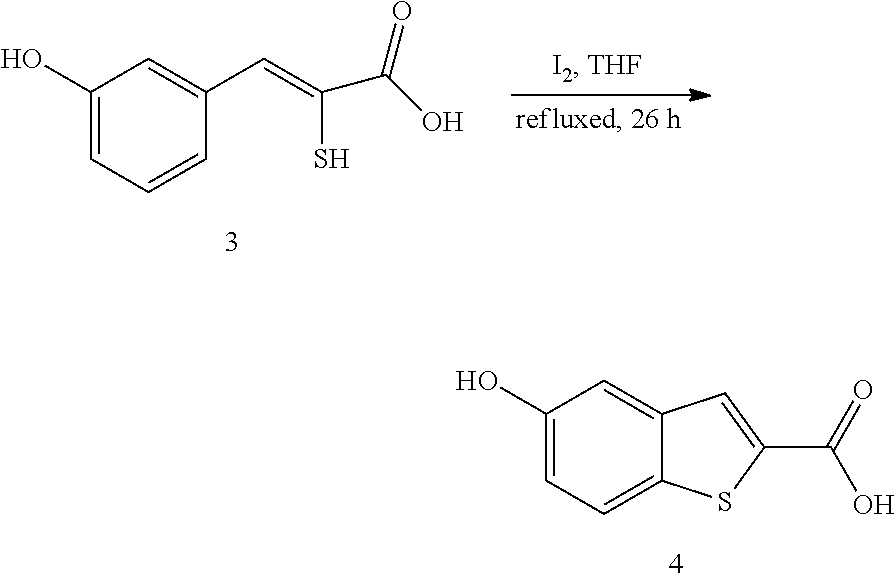 5-Hydroxy-2-(4-methylpiperazine-1-carbonyl)benzo[b]thiophene-4-carbaldehyde was obtained by the above procedure from amine A3. 10% yield. 1HNMR (DMSO, 400 MHz): δ 10.53 (s, 1H, CHO), 8.30 (s, 1H, ArH), 8.10 (d, 1H, J=8.8 Hz, ArH), 7.10 (d, 1H, J=8.8 Hz, ArH), 3.61 (t, 4H, J=4.4 Hz, CH2), 2.32 (s, 4H, CH2), 2.17 (s, 3H, CH3). MS [ESI, MH+]: 305.2.
