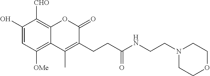 4-Formyl-5-hydroxy-N-(2-morpholinoethyl)benzofuran-2-carboxamide was obtained by the above procedure from amine A5. 21.7% yield. 1HNMR (MeOD, 400 MHz): δ 7.72 (d, 1H, J=1.2 Hz, ArH), 7.40 (dd, 1H, J=8.8 Hz, 1.2 Hz, ArH), 6.97 (d, 1H, J=8.8 Hz, ArH), 5.87 (s, 1H, NH), 4.08 (m. 2H, CH2), 3.80 (t, 4H, J=5.6 Hz, 2CH2), 3.68 (d. 2H, J=12.0 Hz, CH2), 3.25-3.17 (m, 2H, CH2); MS [ESI, MH+]: 319.2.