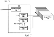 FIG. 7 provides additional details about how the hash-based ledger system works. The operational flow 700 picks up with step 512 of method 500. The indication of the critical portion of the login sample 154 arrives at the validator module 132 in the form of a signature digest 702. The signature digest 702 yields a public key 704 and a content hash 706. The public key 704 is used to decrypt information from the blockchain ledger 134. The content hash 706 is equivalent to the hash functions calculated from the login sample 154 at step 514. By applying the public key 704 to the blockchain ledger 134, the validator module 132 is able to determine a ledger hash 708. The ledger hash 708 is equivalent to the hash values (media layer hash 162 and media layer hash 164) read from the blockchain ledger 134 at step 516. As shown in FIG. 7, the validator module 132 may then compare the content hash 706 with the ledger hash 708 as described for step 520 of method 500.