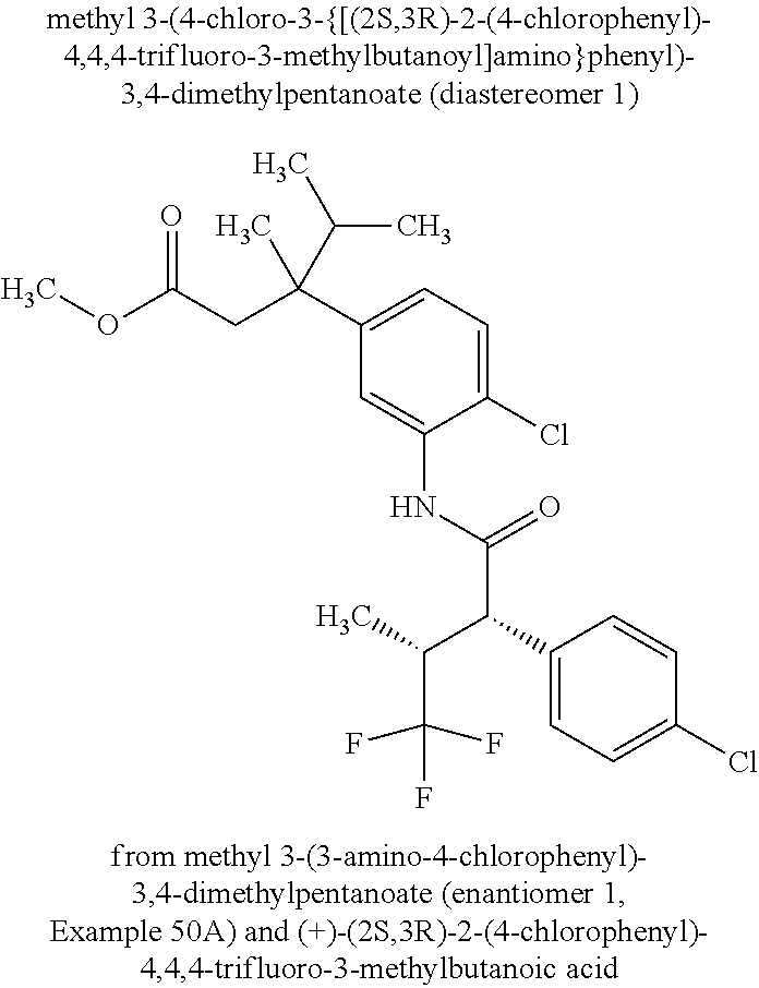 After several (generally 4) control cycles, the substance to be investigated is added in each further run in increasing dosage, and the level of the contraction achieved under the influence of the test substance is compared with the level of the contraction reached in the last preceding run. The concentration necessary to reduce the contraction reached in the preceding control by 50% is calculated from this (IC50). The standard application volume is 5 μl. The proportion of DMSO in the bath solution corresponds to 0.1%.