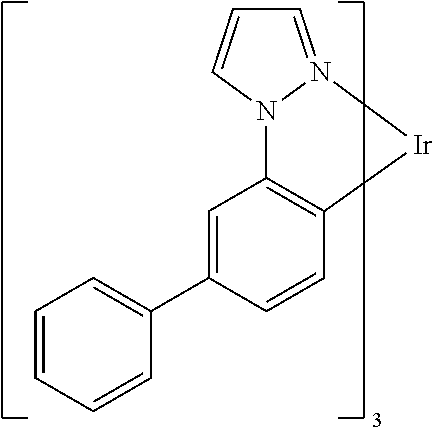 More examples for each of these layers are available. For example, a flexible and transparent substrate-anode combination is disclosed in U.S. Pat. No. 5,844,363, which is incorporated by reference in its entirety. An example of a p-doped hole transport layer is m-MTDATA doped with F.sub.4-TCNQ at a molar ratio of 50:1, as disclosed in U.S. Patent Application Publication No. 2003/0230980, which is incorporated by reference in its entirety. Examples of emissive and host materials are disclosed in U.S. Pat. No. 6,303,238 to Thompson et al., which is incorporated by reference in its entirety. An example of an n-doped electron transport layer is BPhen doped with Li at a molar ratio of 1:1, as disclosed in U.S. Patent Application Publication No. 2003/0230980, which is incorporated by reference in its entirety. U.S. Pat. Nos. 5,703,436 and 5,707,745, which are incorporated by reference in their entireties, disclose examples of cathodes including compound cathodes having a thin layer of metal such as Mg:Ag with an overlying transparent, electrically-conductive, sputter-deposited ITO layer. The theory and use of blocking layers is described in more detail in U.S. Pat. No. 6,097,147 and U.S. Patent Application Publication No. 2003/0230980, which are incorporated by reference in their entireties. Examples of injection layers are provided in U.S. Patent Application Publication No. 2004/0174116, which is incorporated by reference in its entirety. A description of protective layers may be found in U.S. Patent Application Publication No. 2004/0174116, which is incorporated by reference in its entirety.