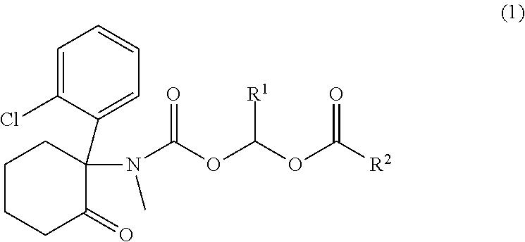 2 are defined as for Formula (1). The acyloxyalkyl promoiety is cleaved in vivo to release ketamine into the systemic circulation.