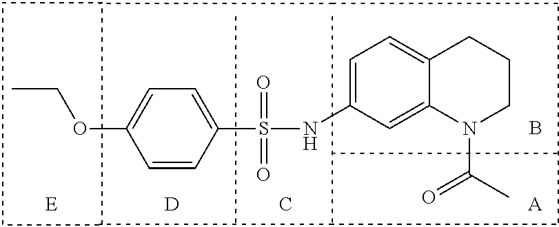 In a further embodiment, R1 is a chain or ringed moiety of C4 or less, B is a closed or open-ringed tetrahydroquinoline, C is a sulfonamide, iminosulfonamide, or phosphonamide, having an amide nitrogen substitution selected from N—H, N-D, N—OH, or N-methyl attached thereto, R4 is a single or multi-ringed substituted or unsubstituted aromatic, and R5 is a substituted or unsubstituted aromatic having a polar and electron-donating group disposed at either position 3 or 4 on the terminal aromatic ring of R4.