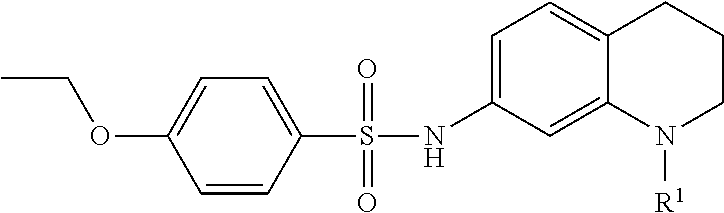 In still yet another embodiment, R1 is a chain or ringed moiety of C4 or less, B is a closed or open-ringed tetrahydroquinoline, C is a sulfonamide, iminosulfonamide, or phosphonamide, having an amide nitrogen substitution selected from N—H, N-D, N—OH, or N-methyl attached thereto, R4 is a single or multi-ringed substituted or unsubstituted aromatic, and R5 is a substituted or unsubstituted aromatic having a polar and electron-donating group disposed at either position 3 or 4 on the terminal aromatic ring of R4.