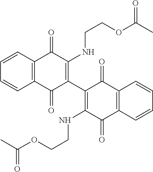 As used herein, the term “dimeric naphthoquinone” refers to compounds having a structure according to Formula B, below, winch optionally can contain substitutions at any of the available numbered locations. These compounds also have been known as BiQ, dimeric quinones, binaphthoquinones, biquinones, bisnapthoquinones, bisquinones, oligomeric naphthoquinones, 2,2′-dimeric naphthoquinones, and are exemplified by, e.g., bis-aziridinyl dimeric naphthoquinone, halohydroxy dimeric naphthoquinone, hydroxylated dimeric naphthoquinone, halomethoxy dimeric naphthoquinone, and the like.
