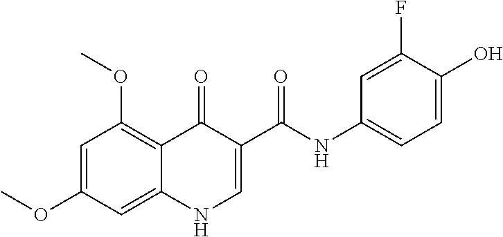Prepared from 5,7-dimethoxy-4-oxo-1,4-dihydroquinoline-3-carboxylic acid (300 mg, 1.20 mmol) and 2-aminophenol (131.3 mg, 1.20 mmol)) by a procedure similar to that reported for 5,6,7-trimethoxy-4-oxo-N-(3,4,5-trimethoxyphenyl)-1,4-dihydroquinoline-3-carboxamide (Compound 19) to give N-(3-fluoro-4-hydroxyphenyl)-5,7-dimethoxy-4-oxo-1,4-dihydroquinoline-3-carboxamide (Compound 41) (4.0 mg, 1.0% yield) as a white solid. Preparative HPLC Method B. LCMS: 100.0% (RT: 1.477, 260.0 nm) (MS: ESI+ve 341.33 [M+H]). 1H NMR: (400 MHz, DMSO-d6) δ ppm: 3.878 (s, 6H), 6.492-6.496 (d, 1H, J=1.6), 6.657-6.662 (d, 1H, J=2), 6.765-6.807 (m, 1H), 6.880-6.912 (t, 2H, J=6.4), 8.313-8.333 (d, 1H, J=8), 8.634 (s, 1H), 10.008 (s, 1H), 12.623 (s, 1H).