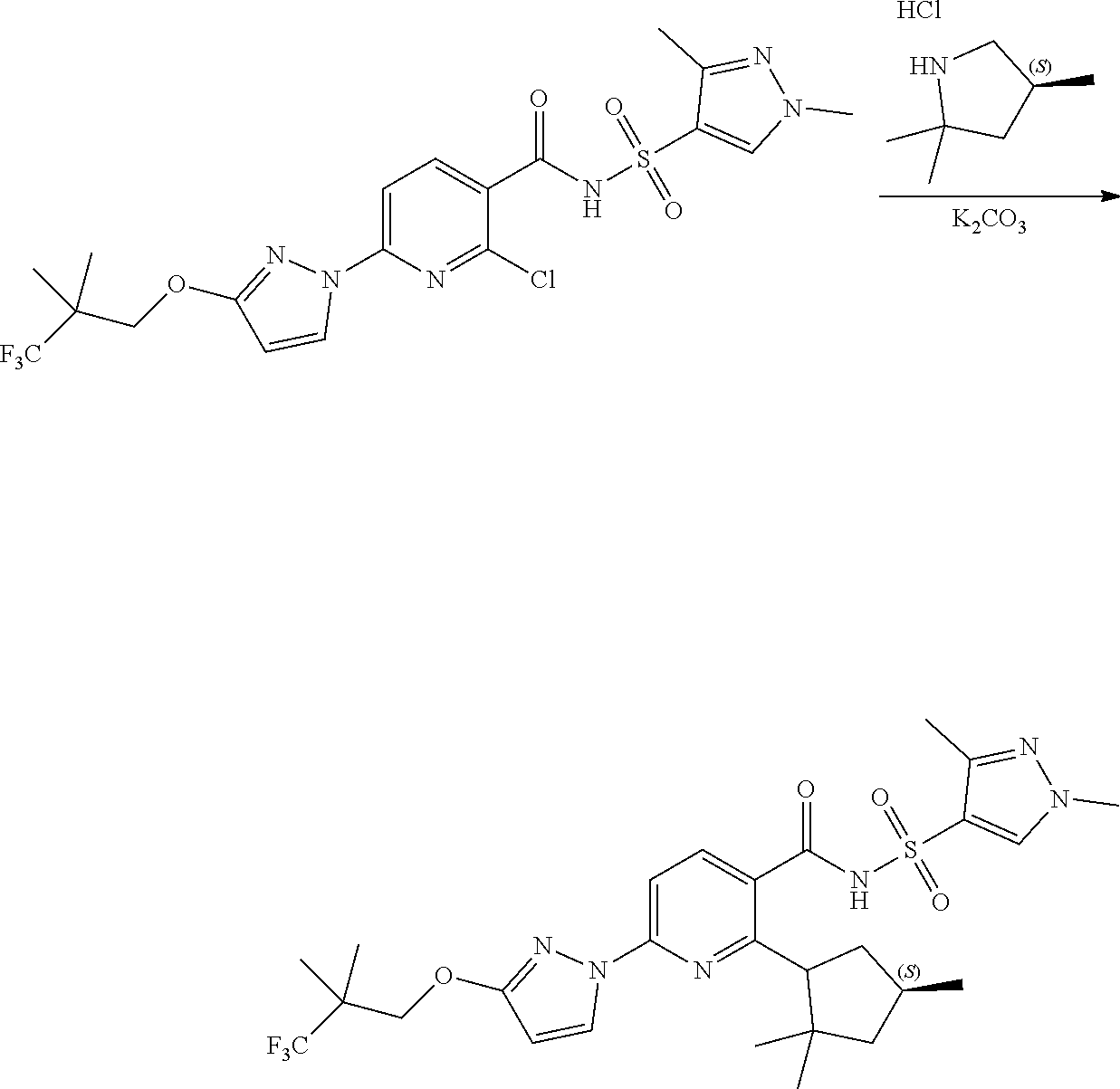 - a chemical name for Compound I is N-(1,3-dimethylpyrazol-4-yl)sulfonyl-6-[3-(3,3,3-trifluoro-2,2-dimethyl-propoxy)pyrazol-1-yl]-2-[(4S)-2,2,4-trimethylpyrrolidin-1-yl]pyridine-3-carboxamide.