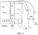 FIG. 9 schematically illustrates radiant thermal zones illustrating a modeled Hybrid thermal transfer heat sink to remove heat from Zone A below the epidermis, into the skin (epidermal layer) in Zone B. This is done naturally by the body if the Temperature of the skin Ta is colder than body temp, or Ta. The skin is a near perfect radiator with an emissivity of 0.97 (e=0.97). Heat is then transferred from the body via the skin in Zone B, through a medium in Zone C and absorb by a cooler medium (heat sink) in Zone D. Zone C could be air or reduced humidity air. Zone D would have a high coefficient of thermal absorption (α˜1). The heat sink in Zone D could then have a heat exchanger that would pump heat out of component D and into an internal or external cooler. It is well known that coolers emit heat. Heat from the cooler then could be routed away from the body. A secondary heating loop could be monitored and regulated for temperature and pressure. This loop could be restricted and/or valved, mixed with ambient air, and fed back into zone C to help regulate skin temperature and hypothalamus sensation if a control system is used to increase skin and/or core temperature to aid with comfort and/or avoidance of arrector pili muscle engagement and/or shivering. The secondary loop can be intermittent, constant, and/or cycled. The secondary loop can include sensors and/or a fan to induce convection. Zone C could include a low absorption air barrier such that the return (warm air) does not cool Zone D. The secondary loop air circuit can include a means to dehumidify the air prior to entering Zone C. The secondary loop could be used to wick away perspiration. The secondary loop could also have a valve that can redirect all of the heat away from the body. The valve could be electronically or mechanically actuated to adjust secondary heating temperature. Vacuum could be created in Zone C by establishing vacuum on the exiting air while physically confining Zone C. Alternately, static vacuum cups with low a absorption coefficients could be used to hold vacuum. In this example the primary heat transfer mechanism will be radiant heat loss to Zone D. Heat gain and/or loss will present in the form of convection to the air in Zone C. Zone C could contain a porous or open support structure that could be either flexible or stiff, to ensure that Zone D does not touch the skin in Zone B.