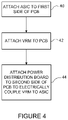 FIG. 4 is a flowchart illustrating an overview of a process for electrically coupling the VRM 14 and ASIC 12 mounted on the first side 15 of the printed circuit board 10 through the power delivery board 16 mounted on the second side 17 of the printed circuit board (FIG. 1 ), thereby enhancing power delivery to the ASIC, in accordance with one embodiment. A substrate, such as the printed circuit board 10 shown in FIGS. 1, 2, and 3 and described above is provided. One or more ASICs 12 are mounted to a first side (e.g., top side 15) of the printed circuit board 10 (step 40) (FIGS. 1 and 4 ). The ASIC 12 may be mounted to the printed circuit board 10 by soldering with a BGA, for example. One or more voltage regulator modules 14 are also mounted on the first side of the printed circuit board 10 (step 42). One or more of the power delivery boards 16 are mounted on a second side (e.g., bottom side 17) of the printed circuit board 10 (e.g., corresponding to the number of ASICs mounted on the PCB) to electrically couple the VRMs 14 and the ASICs 12 through the power planes 28 a in the power delivery board 16 and vertically aligned vias (26 a, 30 a) (24 a, 22 a) in the power delivery board and printed circuit board, respectively (step 44).
