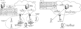 In example implementation 100, a coverage area for a MEC device is indicated in the MEC proximity service information using a latitude of the MEC device (shown as Lat1 and Lat2, for MEC A and MEC B, respectively), a longitude of the MEC device (shown as Lon1 and Lon2), and a communication range of the MEC device (e.g., a radius of communication, shown as Rad1 and Rad2). In some implementations, the coverage area may be indicated using fewer parameters, additional parameters, and/or different parameters, such as an elevation of the MEC device, geographic coordinates of the MEC device (e.g., GPS coordinates), a set of boundary points of the coverage area, a maximum transmit power of the MEC device, and/or the like. In some implementations, multiple coverage areas may be indicated for a MEC device, and each coverage area may correspond to a different RAT supported by the MEC device.