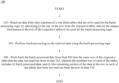 - FIG. 1 is a flowchart 100 of one preferred embodiment of the DFBP method. More specifically, the DFBP method is a method of batch processing data that is stored in multiple tables and is organized in the tables as a plurality of rows of data and a plurality of columns. Each row is identified by a key, and each column represents a field having a unique field name.