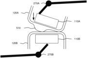 FIGS. 5A and 5B illustrate examples of situations when the first anastomosis device component 110A and the second anastomosis device component 110B are misaligned. In the example of FIG. 5A, matter 510 is trapped between the first lumen 120A and the second lumen 120B. In the example of FIG. 5B, the walls of the lumens 120 may have irregular thickness. For example, when creating an anastomosis in the small intestine of the patient, portions of the mesentery may get trapped in between the first anastomosis device component 110A and the second anastomosis device component 110B. In another example, the walls of the lumens 120 may contain fibrotic tissue that may be trapped in between first anastomosis device component 110A and the second anastomosis device component 110B.