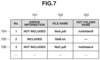 In step S605, the print job list generation unit 304 generates or updates the print job list based on the hot folder information acquired in step S602 and the information about the file moved to the private folder. The print job list is as illustrated in FIG. 7 , for example. In a case where a file named “fileA.pdf” as PDF data is copied in a hotfolderB 405, a list 704 is saved. Error information 701 indicates “not included”, a file name 702 indicates “fileA.pdf”, and a hot folder name 703 indicates “hotfolderB”. The information in the print job list illustrated in FIG. 7 is shared between this processing flow and a print job generation processing flow, described below, (in FIG. 8 ). The information in the print job list can be shared between the two processing flows using a shared memory. Alternatively, the information can be passed between the flows using a queue system. When the generation of the print job list is completed, the processing returns to step S601. In other words, in a case where a plurality of files is continuously copied, the processing flow is executed on the file in order of detecting the copying of the files. Just after the generation or updating of the print job list is completed, the processing flow is immediately executed on the next file, the copying of which is detected.