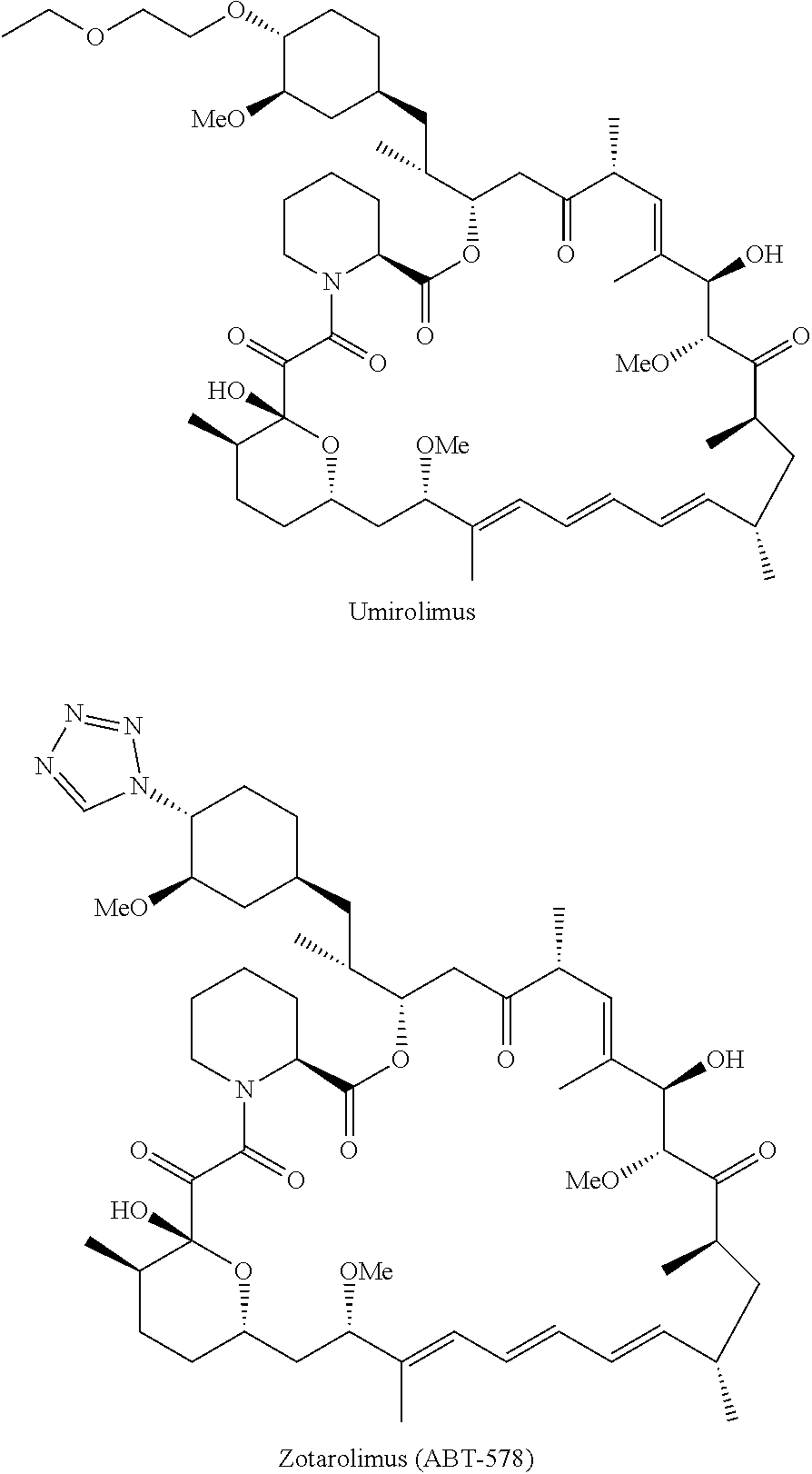 Rapamycin is also referred to by its generic drug name, sirolimus (see for example, ANDA #201578, by Dr. Reddys Labs Ltd., approved May 28, 2013). Sirolimus is FDA approved and marketed in the United States for the prophylaxis of organ rejection and renal transplantation under the trade name RAPAMUNE by Wyeth (Pfizer). It is in the form of an oral solution (1 mg/ml) or tablet (multiple strengths). Wyeth (Pfizer) also markets a derivative by the tradename TORISEL (temsirolimus) for the treatment of advanced renal cell carcinoma, which is administered intravenously. Temsirolimus is a water-soluble prodrug of sirolimus. Cordis, a division of Johnson & Johnson, markets a sirolimus-eluting coronary stent under the tradename CYPHER. In this context, the antiproliferative effects of sirolimus prevent restenosis in coronary arteries following balloon angioplasty. US 2010/0305150 to Berg et al. (Novartis) describes rapamycin derivatives for treating and preventing neurocutaneous disorders, such as those mediated by TSC including tuberous sclerosis, as well as those mediated by neurofibromatosis type 1 (NF-1). Rapamycin and its derivatives are further described in Nishimura, T. et al. (2001)Am. J. Respir. Crit. Care Med. 163:498-502 and in U.S. Pat. Nos. 6,384,046 and 6,258,823.