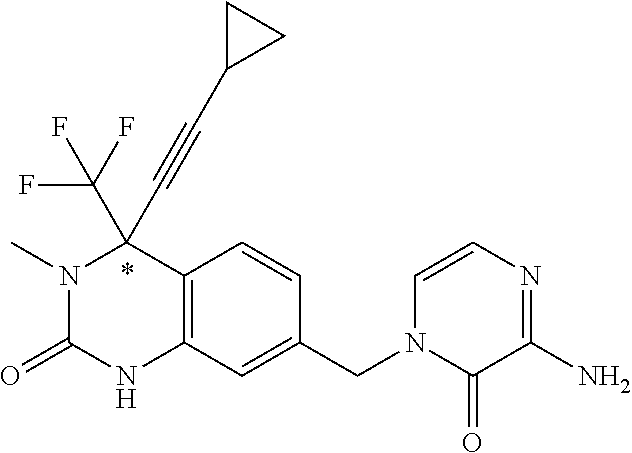 While effects of NNRTIs on dimerization of RT and GAG-POL have been documented (Tachedjian et al. Proc. Natl. Acad. Sci. U.S.A. 2001, 98(13):7188; Tachedjian et al. FEBS Lett. 2005, 579:379; Figueiredo et al. PLOS Path. 2006, 2(11):1051; Sudo et al. J. Virol. 2013, 87(6):3348), selective killing of HIV infected cells as a result of enhanced dimerization was first reported by Jochmans et al. (Jochmans et al. Retrovirology 2010, 7:89). The authors generated data showing these effects in chronically infected MT-4 cells, PBMCs, and CD4+ cells. Based on the potencies of tested molecules they concluded that “These data present proof of concept for targeted drug induced elimination of HIV producing cells. While NNRTIs themselves may not be sufficiently potent for therapeutic application, the results provide a basis for the development of drugs exploiting this mechanism of action.” More recently, Zerbato et al. (Zerbato et al. Antimicrob. Agents Chemother. 2017, 61(3)) measured the activity of NNRTIs in a primary cell model for HIV latency. They saw significant reduction in virus production for certain NNRTIs compared to other classes of antiretrovirals and inferred that this was due to these compounds' ability to eliminate cells expressing HIV GAG-POL proteins. More recently, in their paper Trinité et al. (Trinité et al., Retrovirology, 2019, 16(17)) stated that NNRTI-induced PR-activation triggers apoptotic cell death of productively HIV-infected resting or activated T-cells.