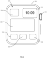 FIG. 10 shows wearable watch device 1000 according to some embodiments of the present invention. In this example, wearable device 1000 is shown as a wristwatch-like device with a face portion 1002 connected to straps 1004A, 1004B. In many embodiments, the electronic device may keep and display time, essentially functioning as a wristwatch among other things. Time may be displayed in an analog or digital format, depending on the device, its settings, and (in some cases) a user's preferences. Typically, time is displayed on a digital display stack forming part of the exterior of the device.