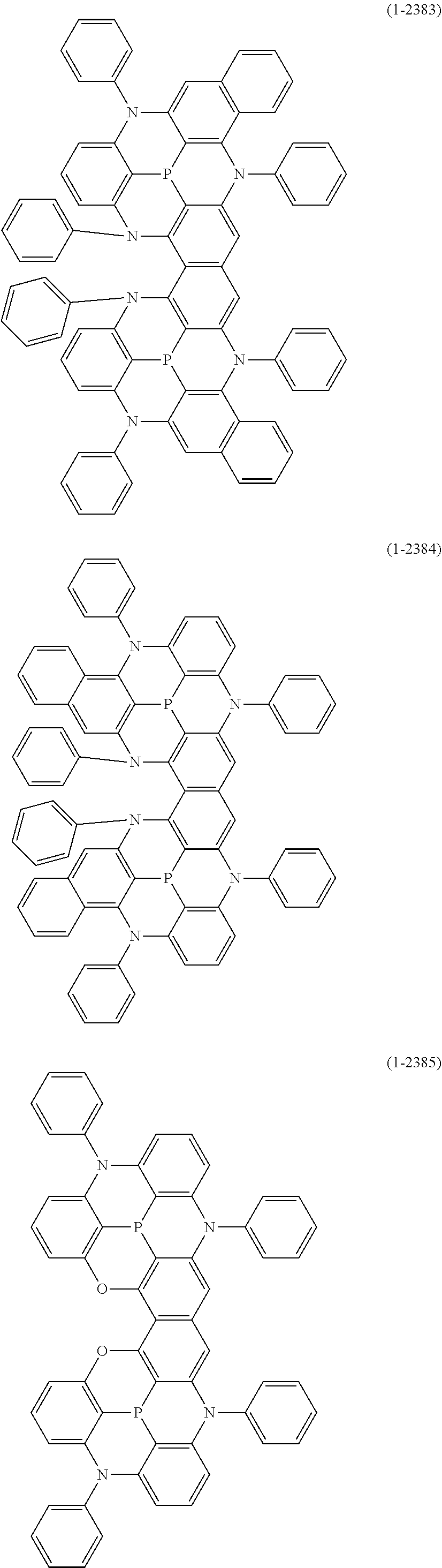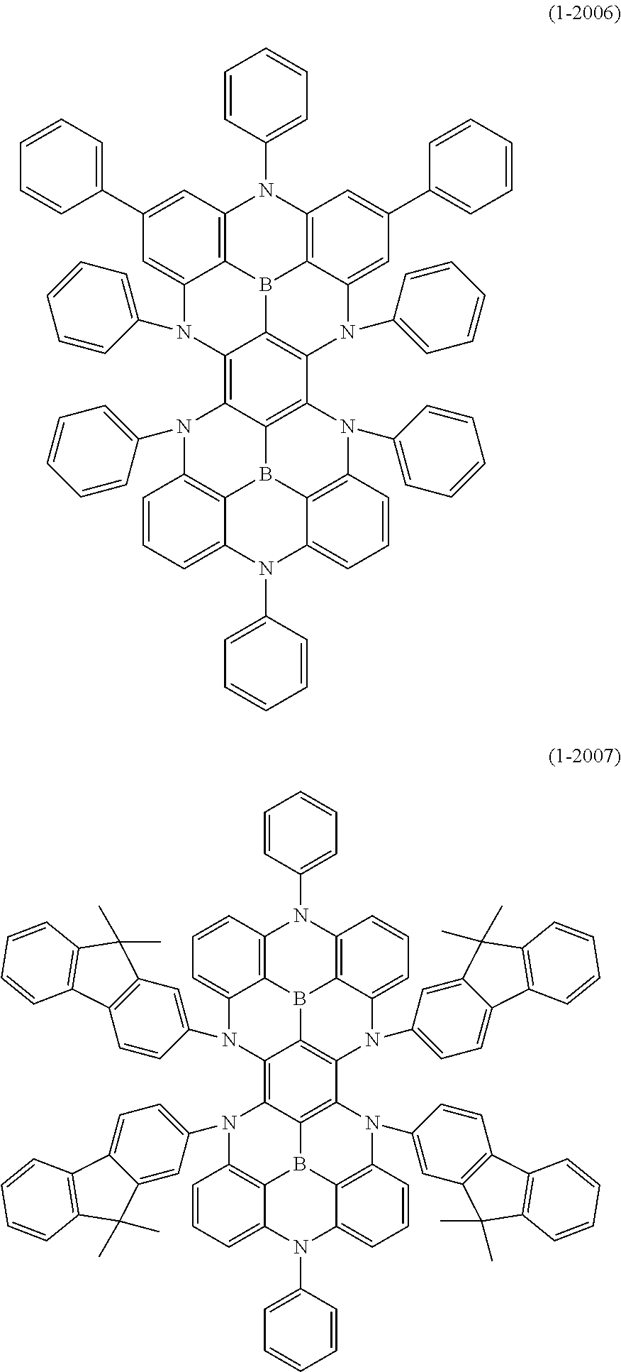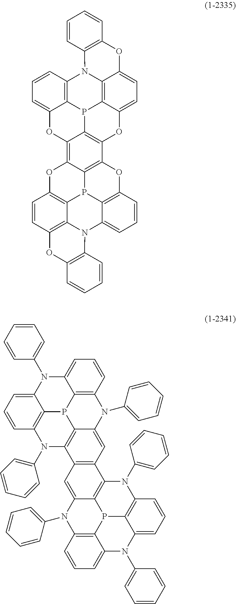 At least one hydrogen atom in the above “aryl ring” or “heteroaryl ring” may be substituted by a substituted or unsubstituted “aryl”, a substituted or unsubstituted “heteroaryl”, a substituted or unsubstituted “diarylamino”, a substituted or unsubstituted “diheteroarylamino”, a substituted or unsubstituted “arylheteroarylamino”, a substituted or unsubstituted “alkyl”, a substituted or unsubstituted “cycloalkyl”, a substituted or unsubstituted “alkoxy”, a substituted or unsubstituted “aryloxy”, a substituted or unsubstituted arylsulfonyl, a substituted or unsubstituted diarylphosphine, a substituted or unsubstituted diarylphosphine oxide, or a substituted or unsubstituted diarylphosphine sulfide, which is a primary substituent. Examples of the aryl of the “aryl”, “heteroaryl”, and “diarylamino”, the heteroaryl of the “diheteroarylamino”, the aryl and heteroaryl of the “arylheteroarylamino”, the aryl of the “aryloxy”, the aryl of the “arylsulfonyl”, the aryl of the “diarylphosphine”, the aryl of the “diarylphosphine oxide”, and the aryl of the “diarylphosphine sulfide”, as these primary substituents include a monovalent group of the “aryl ring” or “heteroaryl ring” described above.